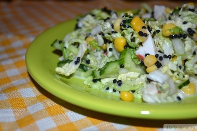 капуста пекинская, кукуруза консервы, крабовые палочки, огурец грунтовый, икра из морских водорослей, йогурт 1,5% , соевый соус, перец черный молотый