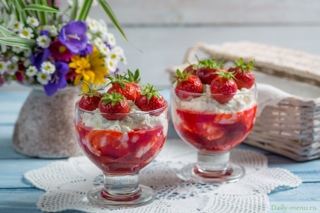 земляника, клубника, творог 0.6%, йогурт натуральный 2%, сахар-песок