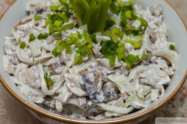 кальмар, шампиньоны, огурец маринованный, яйцо куриное, майонез , лук репчатый, масло топленое, лук зеленый, чеснок, соль поваренная пищевая, перец черный молотый