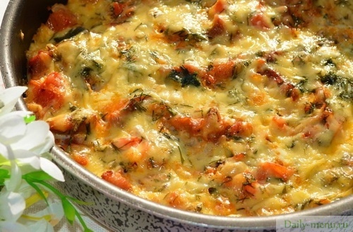 курица (филе) вареная, шампиньоны, помидоры, сыр голландский, сметана 10,0% жирности, лук репчатый, масло подсолнечное, укроп и другие пряные травы, соль поваренная пищевая, перец черный молотый