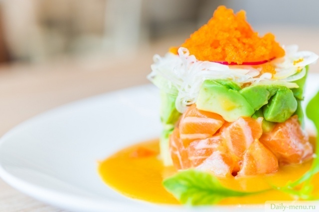 семга слабосоленая , авокадо, сок апельсиновый, лук репчатый, сок лимонный, икра из морских водорослей, масло оливковое